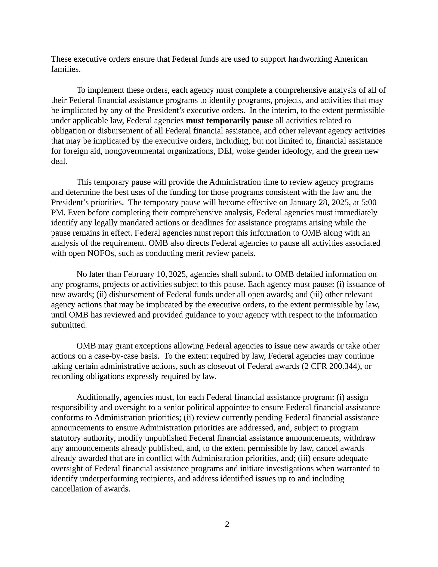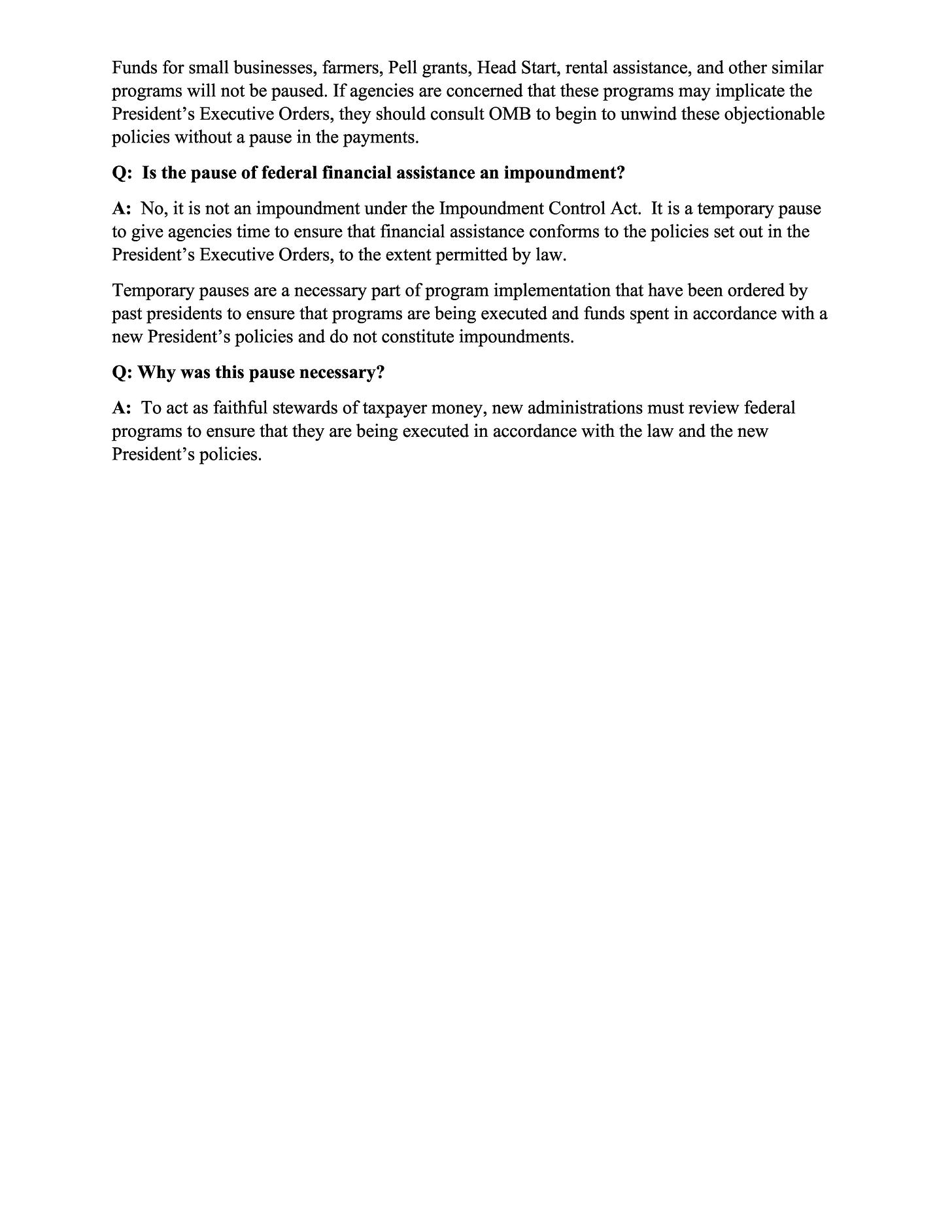 “Federal agencies must identify any legally mandated actions or deadlines for assistance programs arising while the pause remains in effect.”