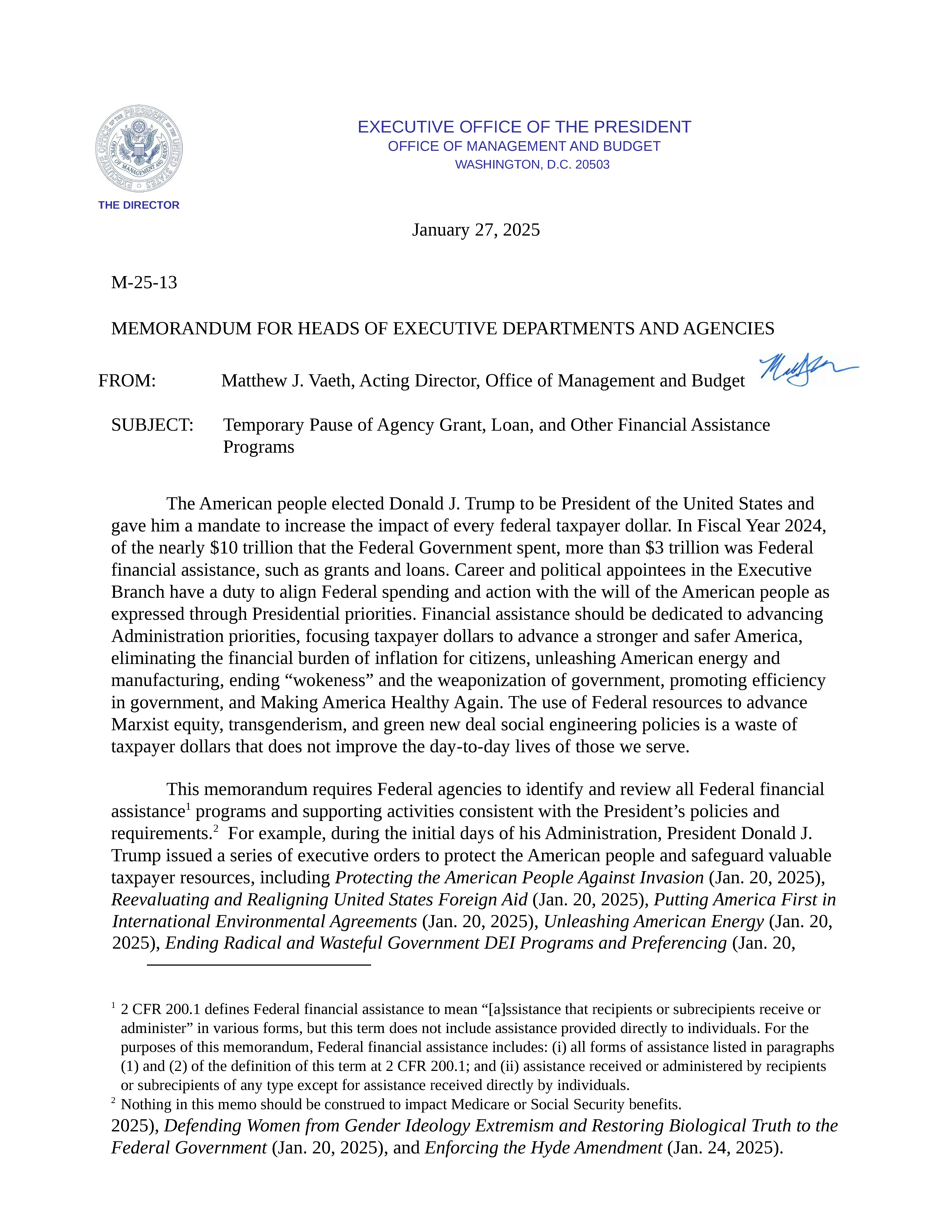 The first OMB memo, M-25-13, orders a government-wide pause on the disbursement of all federal financial assistance, including grants and loans. This order applies to funds already appropriated by Congress, effectively preventing agencies from distributing them. The memo states: