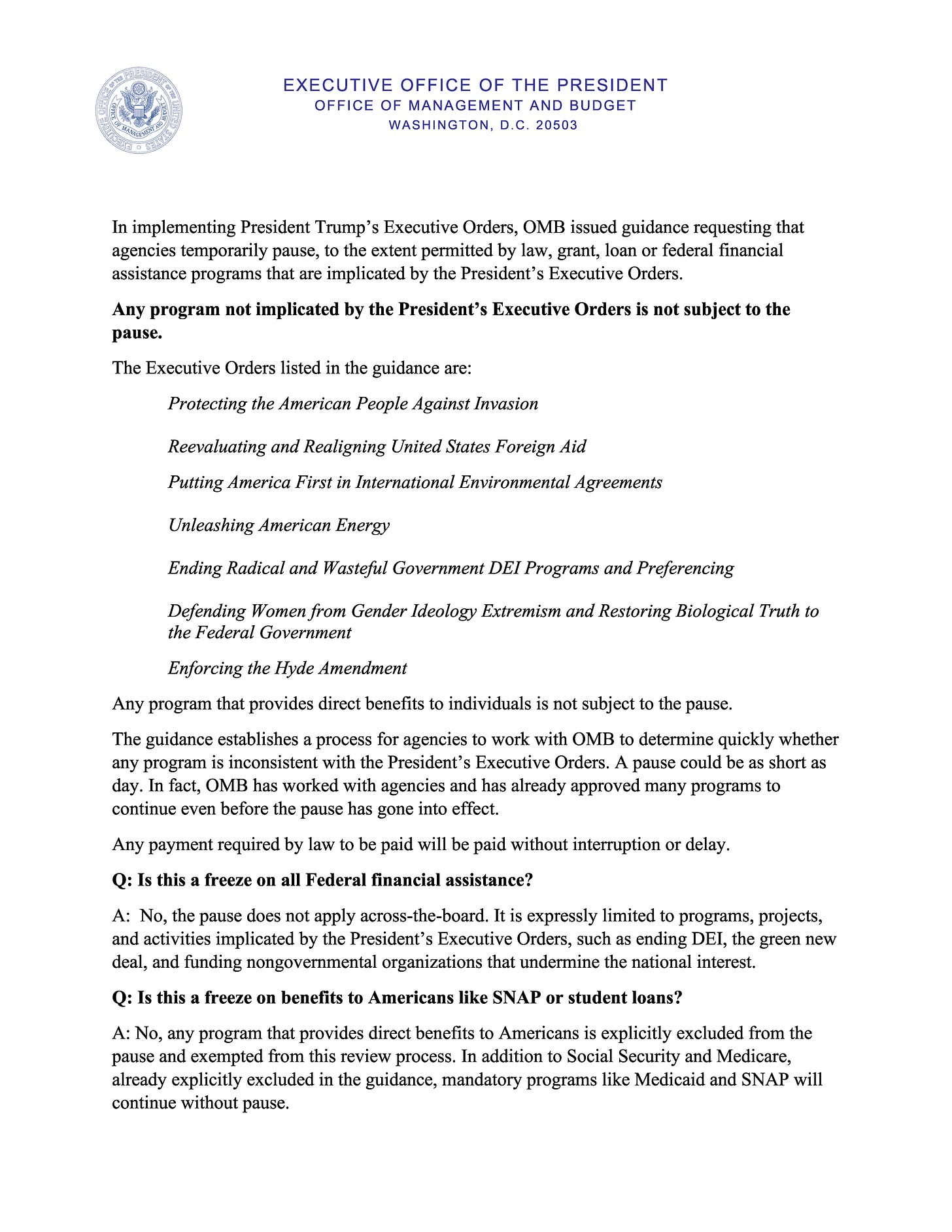 So, when I—who, let’s be honest, am a policy genius—read this thing, I had to break the bad news: grants, loans, and aid were effectively frozen. Not necessarily denied, but delayed. Likely for at least 90 days, if not longer.