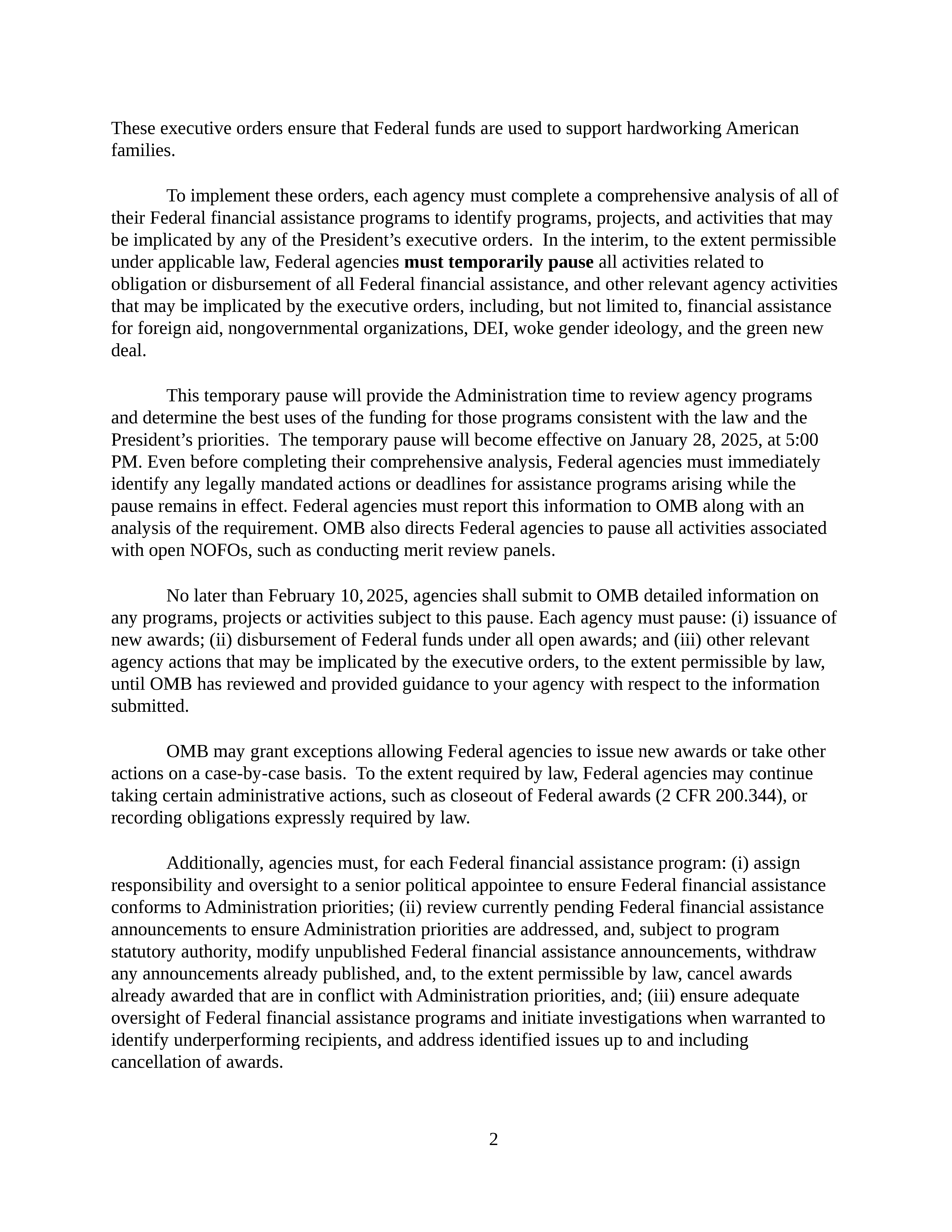 Furthermore, the memo does not cite any statutory authority allowing the administration to issue such a broad pause. Instead, it relies on vague references to presidential priorities, claiming: