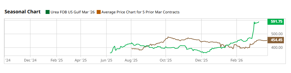 Here’s what I want you to pay attention to instead: urea prices at the New Orleans hub have moved from $475 per metric ton to $579+ per metric ton in the past ten days. For context, urea spent most of 2025 trading between roughly $350 and $450 per metric ton. A move from $475 to nearly $580 in ten days is not routine volatility — it’s a supply shock signal.