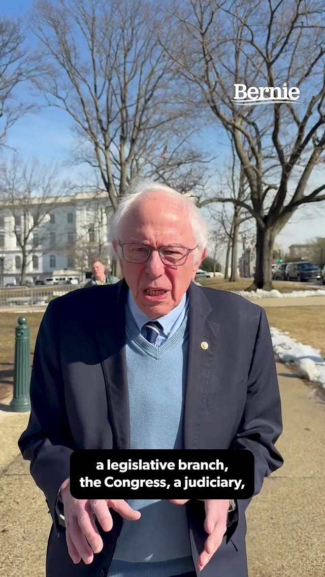 I just saw a TikTok of Bernie Sanders rambling as he strolled through what looked like John Marshall Park this afternoon in D.C., saying, “The Founding Fathers, who were nobody’s fool….blah blah blah… created three equal branches of government with checks and balances.”